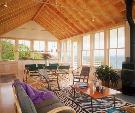 Adding only 500 square feet of interior living space, largely by incorporating an existing screened porch, Gurney addressed all of the functional shortcomings of the existing plan. Where once the front door opened directly into the living room, he used a frosted glass partition to carve out an entry hall. Two window walls open the existing dining area to the backyard gardens. A modest expansion of the bedroom wing boosted closet space to meet contemporary standards.