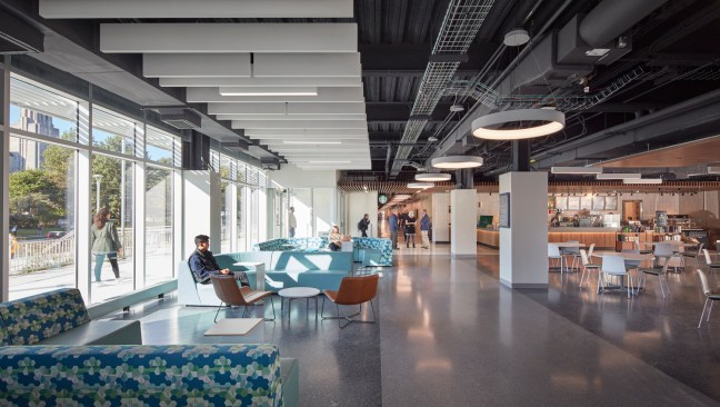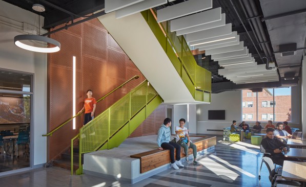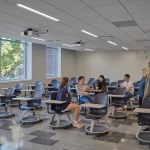 Advancing sustainability as well as innovative learning, the facility is targeting LEED Gold certification. Substantial upgrades to the existing building’s brick, stone, and glass exterior significantly improve the building envelope and reduce energy consumption. Designed to complement the existing structure, the addition also features high-performance elements including horizontal sunshades on the south-facing façade and accommodation for building-integrated photovoltaics (BIPV).