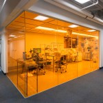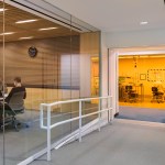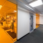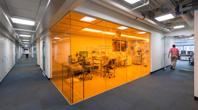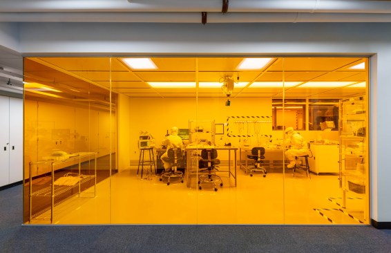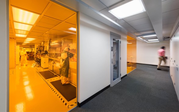 Dubbed “YellowBox” by its users, the Conformable Decoders Group, the cleanroom consists of four major components: an entry/gowning area; a Class 10,000/ISO Class 7 specimen preparation room; a Class 1,000/ISO Class 6 cleanroom; and a mechanical service chase between them, accessible from the adjacent passage. Because all four functions require isolation from adjacent spaces, they were packaged into an efficient, rectilinear gypsum board volume. Full-height glazed openings look directly into the cleanroom spaces, where researchers in full protective equipment are on full display to anyone walking by. The result is an astonishingly intimate connection between them, a visual experience modulated only by the light-filtering colored tint that gives the YellowBox its name.