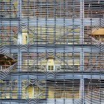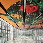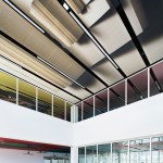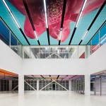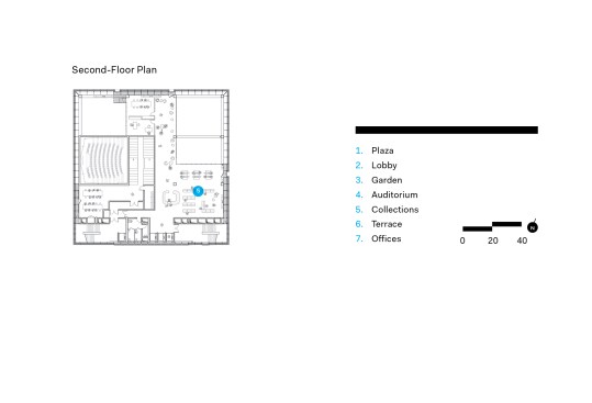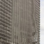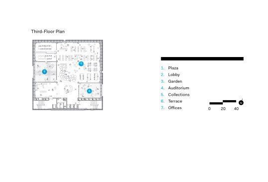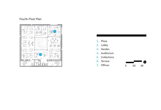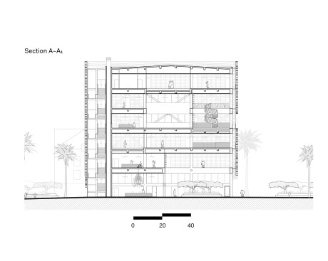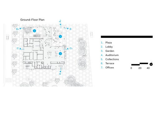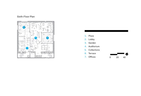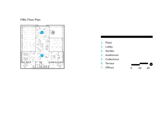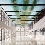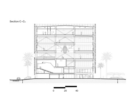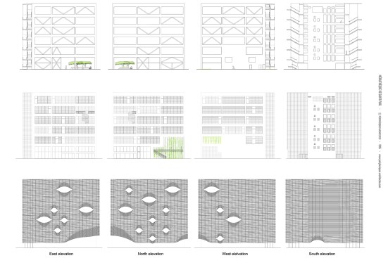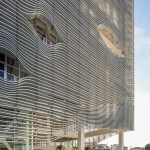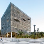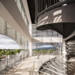 The seven-level structure is a mix of single- and double-height spaces, each with views to the perimeter walls and natural daylight. Behind the fixed sunshades of the outermost façade is an inner layer of steel-framed, operable glass louvers that provide natural ventilation to the interior. Several terraces dot the structure. The perforated, anodized-aluminum fins on the outer façade serve as sunshades that help to regulate the temperature on the open-air platforms, while the eye-shaped openings frame views of the surrounding landscape.