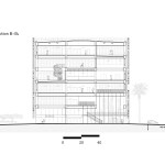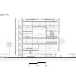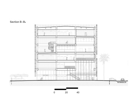 The 49,159-square-foot building’s façade takes cues from the initial program. The wavy, aluminum-fin-clad façade is designed to mimic a stack of book pages, and contains 19 scattered eye-shaped openings—four on the west, six on the east, and nine on the north—which come in two sizes. “It’s a mix between an eye to overlook the city, and the gesture that you must do to see through venetian blinds,” says David Trottin, the partner in charge of the project.