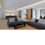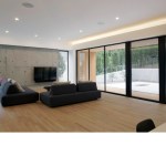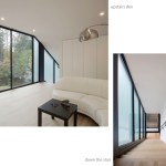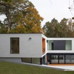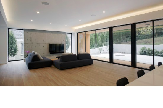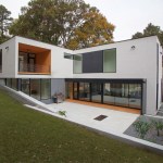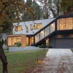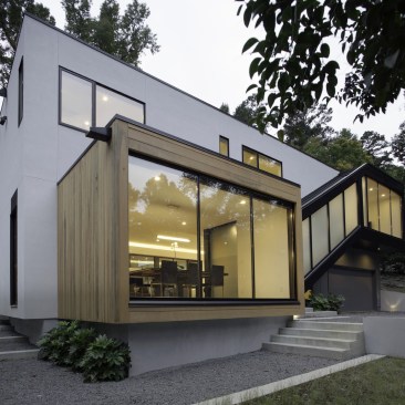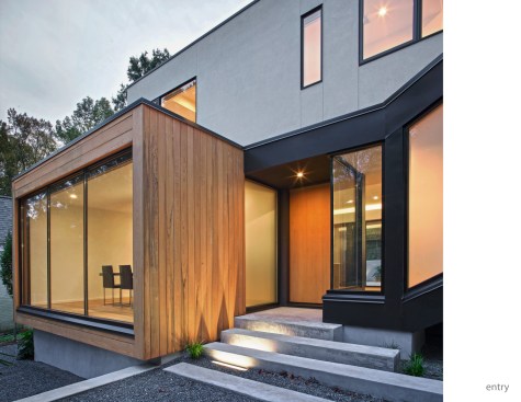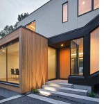 The site is long in the north-south direction and slopes down to the street towards the north. A stream cuts across the northern portion of the site, near the street, and the associated buffer prevented construction on the front half of the property. The extreme topography of the south end prevents the house from being too far back on the property. The design response is a compact L-shaped scheme that creates a courtyard between the house and hillside. Because of the tight footprint, not all public spaces were able to fit on the ground level. Therefore, an informal den is located on the upper level and a stair connecting the living room to this den dominates the expression of the front elevation. Despite large openings to the exterior throughout the public spaces, the design affords privacy within.