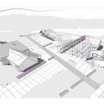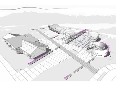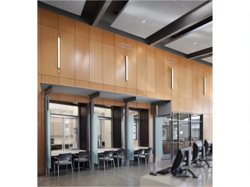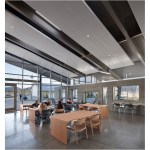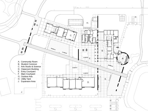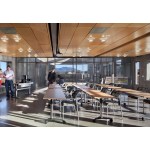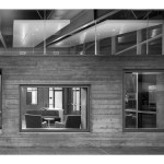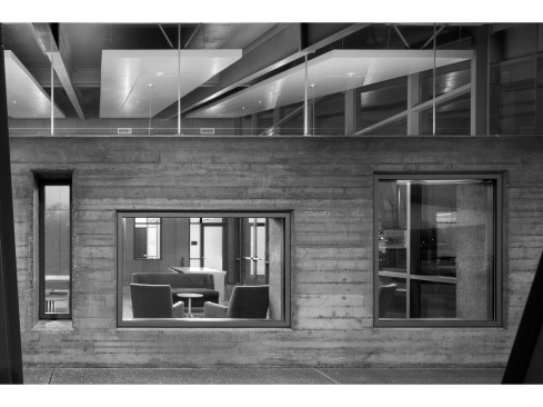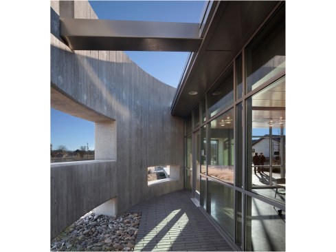 The strong campus geometry is manifest in a series of concrete walls which slash through the site and through the building interior. These board-form concrete walls define program edges and zones which students inhabit. The thick concrete frames allow students to occupy the space of the walls where they have been punctured to reveal views. In another way, the concrete walls act like historical devices by expressing age through their mass and materiality. The building’s structural frame, roof and wall enclosures touch lightly on the concrete elements and on the ground to accentuate distinctions between rootedness and contemporary expression.