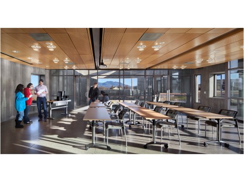 Formally, the project geometry aligns with views in all directions, capitalizing on the context. Surrounding terrain and a neighboring creek setting ooze into the campus interior. Building apertures capture framed views of mountains and oak woodlands, acting as view-finders to the landscape. Overall, the natural context gives order and harmony to the design.