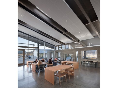 In the same way that landscape views inform openings in the concrete walls, so the walls define the key programmatic relationships. The Student Common, with its framed views of surrounding hills, offers a serene environment for students to study between classes. The Community Room carries the axis of the Mt. Konocti, an ancient volcano and geographic centerpiece of the region, into the interior with a panoramic framed view. An operable wall opens the Arts Studio to the neighboring creek, again connecting student activity to the outdoors. The inside-out definition of space permeates the project.