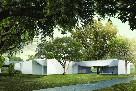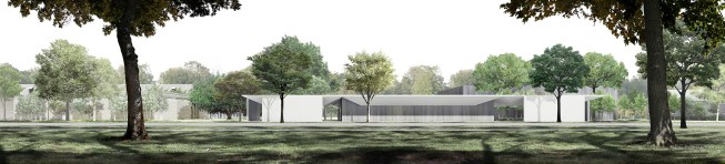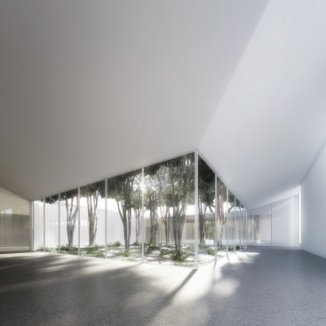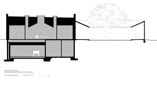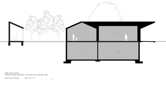 The first freestanding museum dedicated to modern drawing in the United States, the Menil Drawing Institute sits on the tree-shaded campus of the Menil Collection, in the Montrose neighborhood just west of downtown Houston. The institute was founded in 2008, but it wasn’t until 2012 that Los Angeles–based firm Johnston Marklee was chosen to design a $40 million home for it, as part of a master plan by David Chipperfield Architects for the 30-acre campus. Johnston Marklee is perhaps best known for designing private houses, and the firm brings a sense of contemplative domesticity to the 30,000-square-foot institute. Like other buildings in the Menil “neighborhood,” especially the original Menil Collection immediately to the northwest by Renzo Piano, Hon. FAIA—itself the recipient of the AIA Twenty-five Year Award in 2013—the institute has a binary relationship with the harsh Texas sun under which it sits: The wide overhangs of the roof and the leafy canopies of the trees help keep out 90 percent of natural light, while still allowing some spaces to use daylight as their primary source of illumination. The building is composed of three enclosed volumes clad in gray cedar—one each for study (called the “scholars’ cloister”), exhibitions, and administration—arranged under a common, white steel-plate roof. The roof also covers a multifunction, open-air space called the “living room,” which connects the three enclosed volumes and provides a venue for lectures, study, and social functions. Tree-filled courtyards dot the plan—two of which act as entry points for the building.