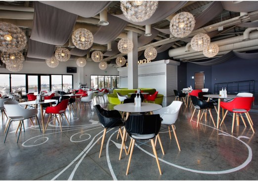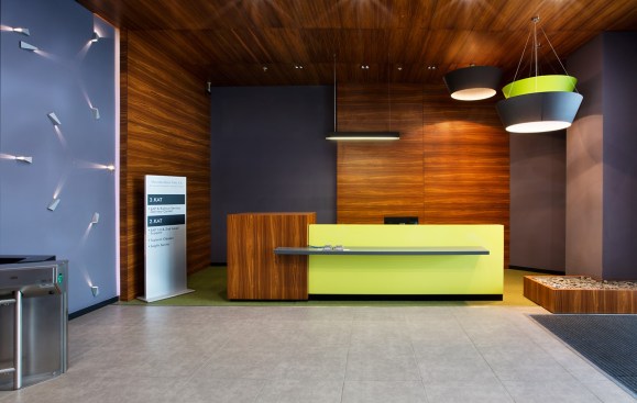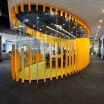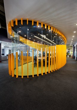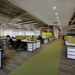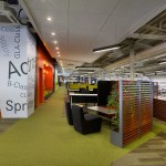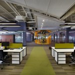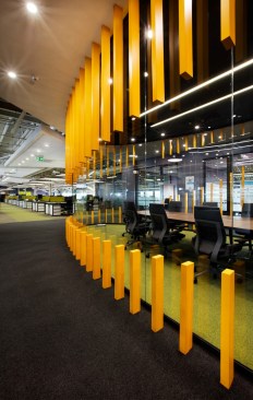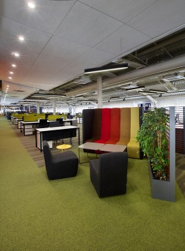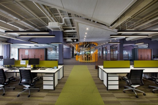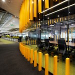 Flexibility, mobility, adaptability as its most pertinent design features, this open-space office is an innovative workspace that encourages interaction and is socially engaging. It is vibrant and is open to change. Centrally placed hubs are highly visible and workstations can be adapted to accommodate growth. The overall design is lively and fun with an industrial edge featuring colorful signage and playfully themed areas. The workspaces can be arranged and re-arranged in different ways to support interactions, various team configurations and workplace activities. The acoustic textile ceiling adds great value to the quality of the open office space.