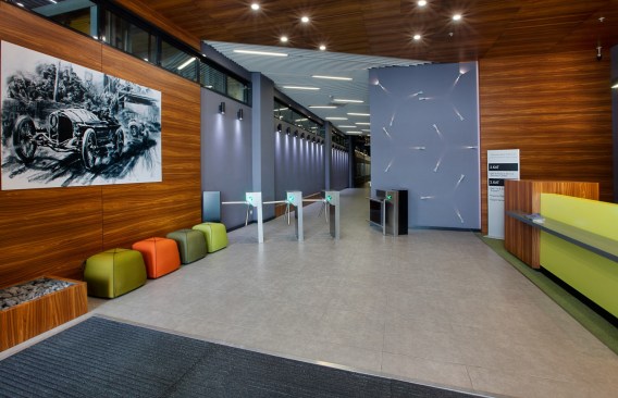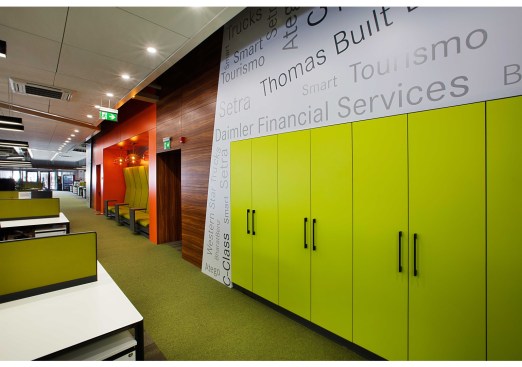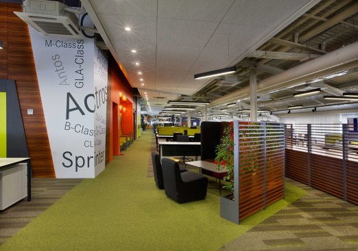 The fit-out for Mercedes Benz Technology Services’ new 5.900 sqm. four-storey office building provides flexible and agile working space for the company’s 360 staff. The new building consolidates new staff and existing staff from a different building and introduces the implementation of a new way of working. It provides a new style of working space for the technology division with a very traditional agora style “war room” where critical decisions are made with meeting areas and a conference center.