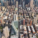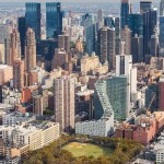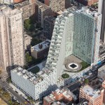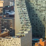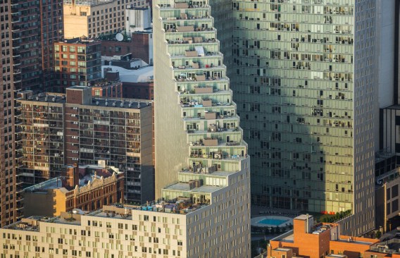 Securing light and air for the great majority of apartments, the double-loaded corridor shifts diagonally across the site in a unique orientation to the Manhattan grid, reducing the building’s mass adjacent to the neighboring buildings. Each floor steps up from the one below, allowing unobstructed views to the park and the Hudson River, and providing private roof terraces with green roofs on every floor.