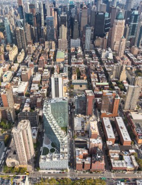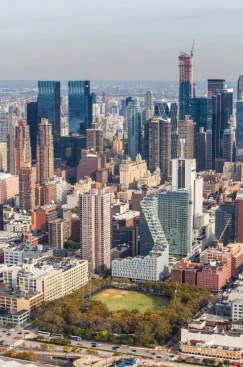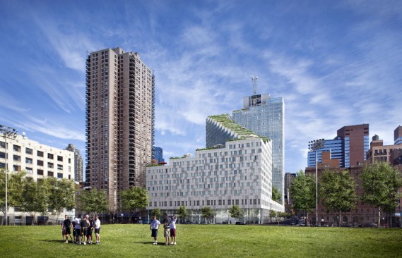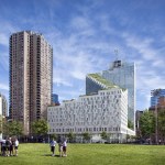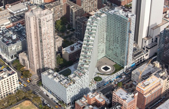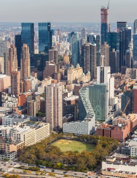 The design is deeply rooted in the unique conditions of the site, sloping up and away from De Witt Clinton Park at a starting height of 86 feet along Eleventh Avenue, and climbing up to 328 feet at its peak. This transition successfully reconciles two distinctly different urban scales: the flat, horizontal plane of the waterfront park on the west, and the dense and predominantly vertical Manhattan grid to the east.
