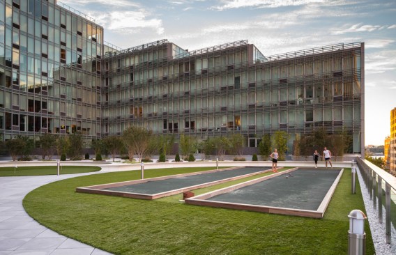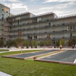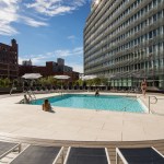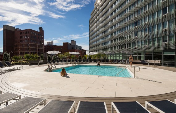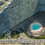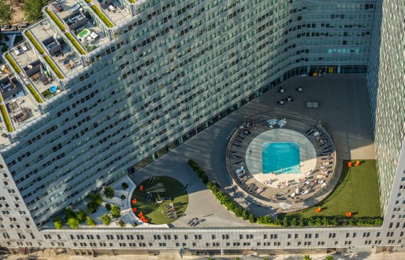 The building’s mirrored structure introduces the creation of two courtyards—a sun-bathed pool garden to the south and a shaded activities court to the north. Through the amenities at its perimeter, the building’s semi-public exterior spaces are activated throughout the day and night.