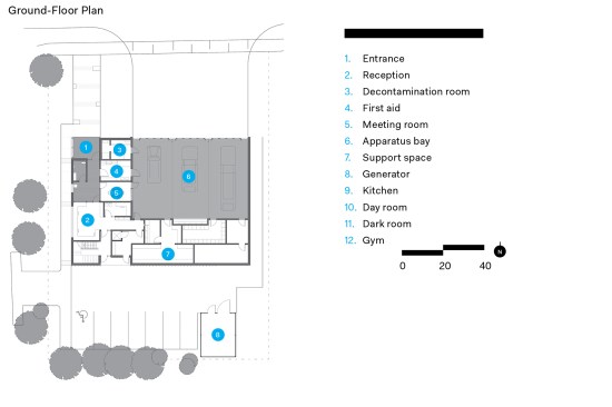 is now home to a firehouse whose crisp modern design seems to place the community on equal footing with big, sophisticated Seattle back on the mainland. Designed by the Seattle office of the Miller Hull Partnership, the building acts as a kind of exhibition space for the technical spectacle of civic service: Through its glazed garage façade, passersby can see the firetrucks as they sit waiting, along with the various tubes and ducts used to maintain them, and the firefighters themselves as they swing into action at the sound of the emergency bell.
