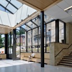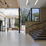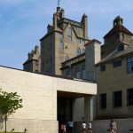 The addition was built six feet below the ground floor of the Mercer original creating a plinth to showcase the castle with unobstructed views. The poured in place concrete’s color and texture complement the historic structure, while windows and glass skylights in stark contrast with the castle’s heavy appearance, frame beautiful views of the castle and a dramatic outdoor courtyard.