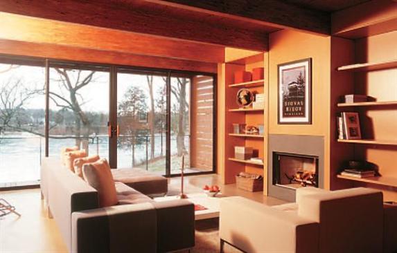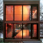 Concrete block foundation, plywood siding, concrete floor. That may sound like the shed your uncle built for his riding mower, but in this Wisconsin lakefront retreat, those humble materials respond to a much higher calling. Designed for a long, narrow site, the house adopts the same bread-loaf proportions as its lot. That simple shape, and panelized construction, made for an extremely straightforward process in erecting the building shell. Wall sections are sided with high-quality veneer plywood in full sheets, with vertical joints covered by batten strips. Window and door openings also follow a 4-foot-wide module, lending a calm and orderly feeling that led one judge to dub this a “Zen house.”