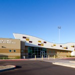 The building’s materials consist of stained split face and smooth face concrete block, green insulated glass systems and stucco exterior finishes. The main building feature is a “wave” form angled to the horizontal geometry of the building and that is expressed on the north and south elevations. This feature integrates a scored pattern in the finish system with colored panels to provide an artful contrast with the wave and horizontal features of the building. The horizontal masonry anchors the building to the landscape while the wave enforces the idea that this is an aquatic complex for Mesa residents and students.