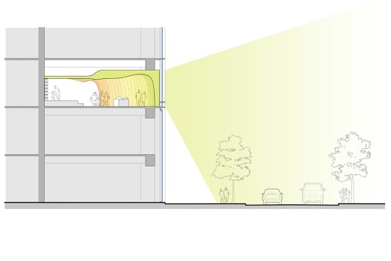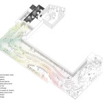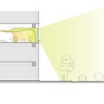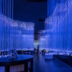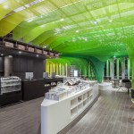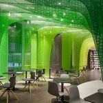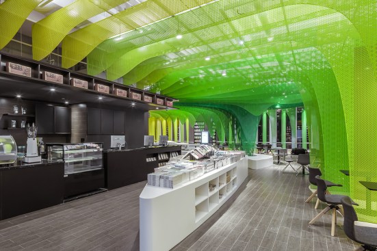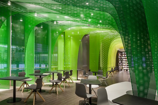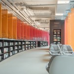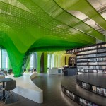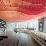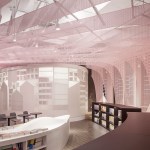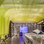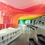 After the whiteness, ‘The Cave of Fireflies’ is a darker tunnel connecting the main hall and the entrance. Customers will pick books here and follow the guide of optic fibers into the main reading area.