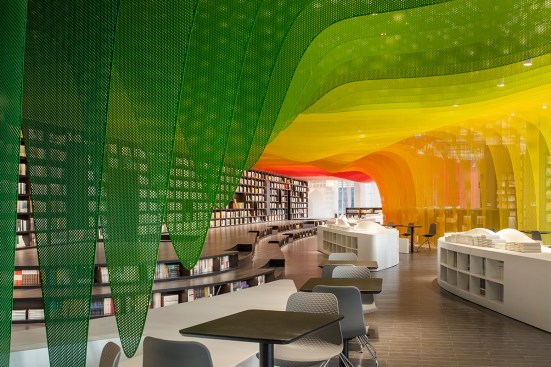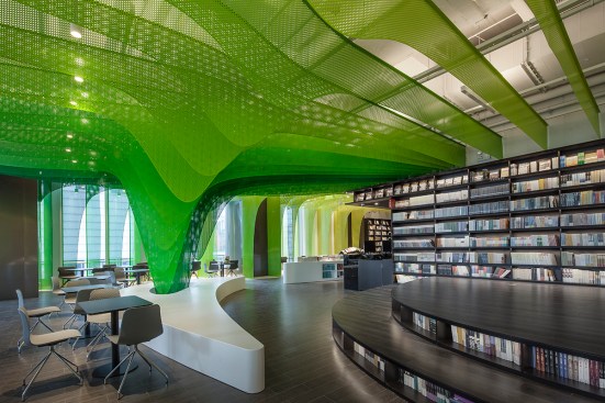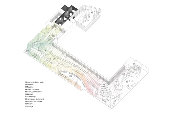 The new bookstore is divided into four main zones and several subdivided zones. Aiming to create a colorful new world by using symbolism, the architect gave a unique character to each zone: The Sanctuary of Crystal for new arrivals; The Cave of Fireflies for recommendations; The Xanadu of Rainbows for reading room; The Castle of Innocence for children books.