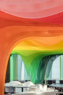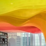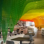 After a relatively narrow space, ‘The Xanadu of Rainbows’ is a large and open space. Thanks to the large windows, natural lights can pour inside. Being the most prominent space, ‘The Xanadu of Rainbows’ provides a variety of experience. Taking advantages of different heights of shelves, steps, and tables, the architect creates a hyper architecturized and abstracted landscape of cliffs, valleys, islands, rapids, and oases. There are also thin perforated aluminum sheets in gradient colors simulated as rainbows installed in the bookstore. These 1cm thin panels divides zones of different functions at the same time bringing a mysterious and vague atmosphere to the space. These moves shape a Xanadu from ancient Chinese philosophy.