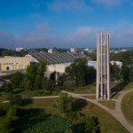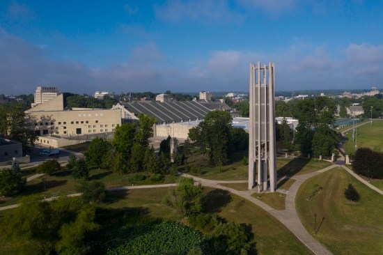 The 61-bell carillon was initially installed in a Brutalist, cast-in-place concrete enclosure to celebrate the university’s sesquicentennial in 1970. Fifty years later, the new tower sees the addition of four bells that extend the instrument’s musical range and give it standing as a grand carillon—one of fewer than 30 in the world.