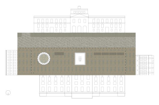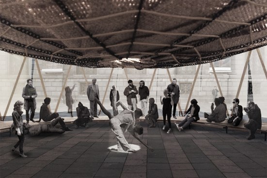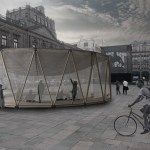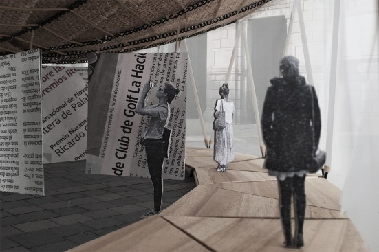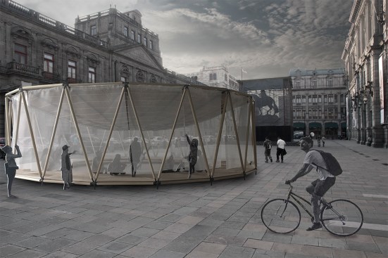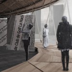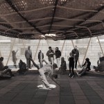 The enclosure of the translucent textile of the pavilion functions as a permeable membrane that allows the free flow through it, and materialize the division between interior and exterior without creating a physical barrier. It allows continuity between public open space and public space with content. In the interior of the pavilion the `space is defined by a perimetric walkway that is slightly elevated from the ground which can be used as a place to sit or where people can freely walk around an exposition. In the middle of the catenary roof we created a void that drains the water and that introduces natural light that creates a center-event and a centripetal-centrifugal dialogue with the city. The pavilion is a catalyst, a forum, a space where ideas flow fluently.