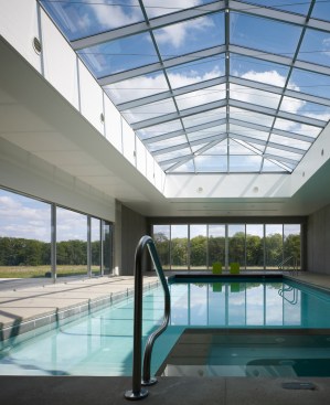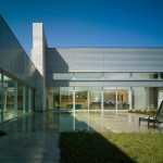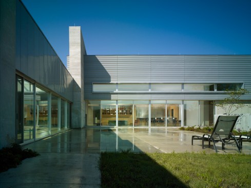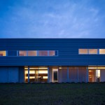 An asymmetrical, axial plan for the house accommodates vehicles and an indoor swimming pool within a long split-volume of double-walled, insulated concrete. This is juxtaposed with an intersecting two-story volume of corrugated metal, steel, and concrete. The second story is a long, horizontal box structured in steel and clad in zinc that extends above a first floor living area where openings between concrete walls are filled with floor to ceiling glass.