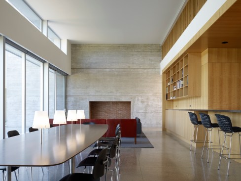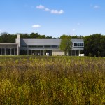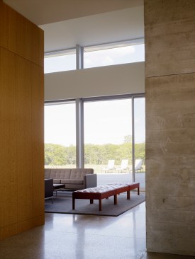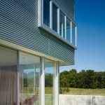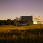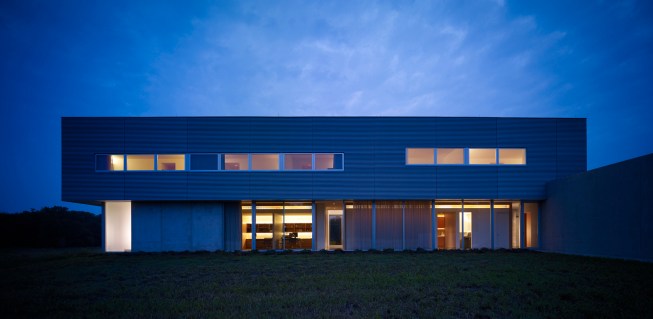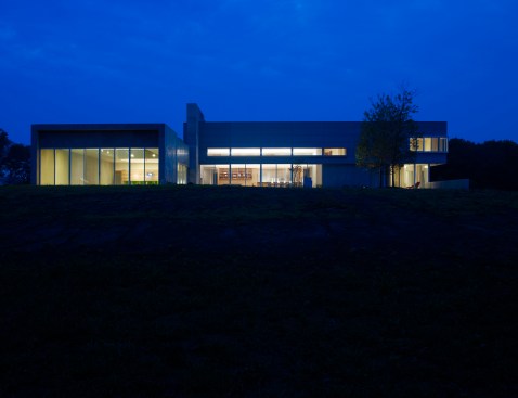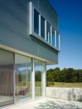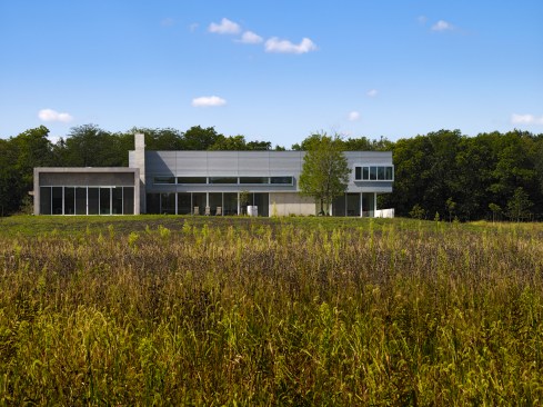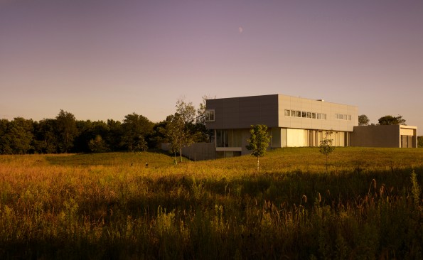 Situated on a pastoral 32-acre field that is surrounded by dense woods and a creek, providing this residence with access to a view was easy. The challenge, however, was to integrate the building design with the site so that it becomes an intrinsic part of the view. This design was inspired by the stone, concrete, and galvanized steel of utilitarian structures such as grain elevators, silos, barns, and sheds that are found among the agrarian buildings within the surrounding landscape.