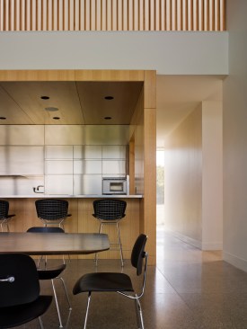 Various rooms are partitioned interior volumes of space, developed from the placement of millwork. Each room transitions into the next, and the house centers on enhanced light, movement, material, and visual connection to the landscape.