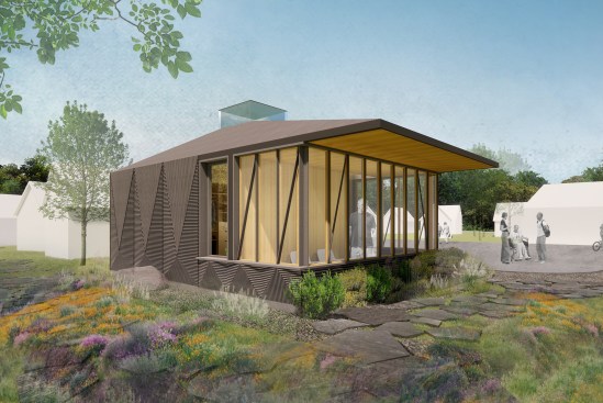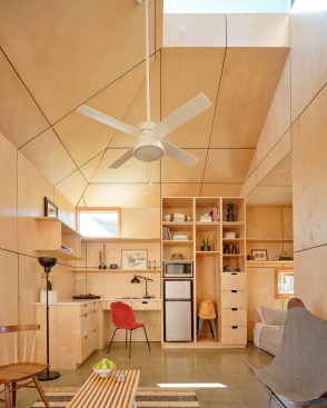 It wasn’t until Richard Devore first moved into Community First! that he recognized the stress he carried when he was homeless. No matter where he rested, “it was never your place,” he says. “You’re always somewhere you don’t belong.” MHOA’s 200-square-foot design aimed to provide Richard with a sense of security. “We asked ourselves, should this be a sort of challenging piece of architecture? Or would it be more appropriate to address our users’ familiarity with what an iconic house looks like?” recalls founding principal Michael Hsu, FAIA. “We felt like that was appropriate as opposed to coming in and asking Richard to live in an architectural blob that we might find interesting.” The design team opted for traditional forms but slightly tweaked: They topped an uncentered, hip roof with a flat-topped, glass cupola, which became the fulcrum of the project, filtering daylight into Richard’s home and functioning as a lantern at night. “It becomes an element that communicates with the rest of the village,” project designer Nkiru Mokwe Gelles says. “It’s a powerful way of conveying community and fellowship in the design itself.”