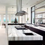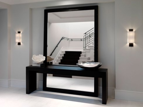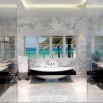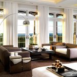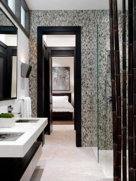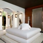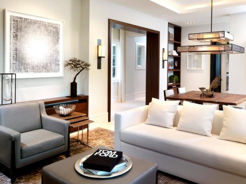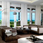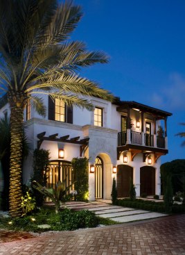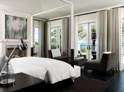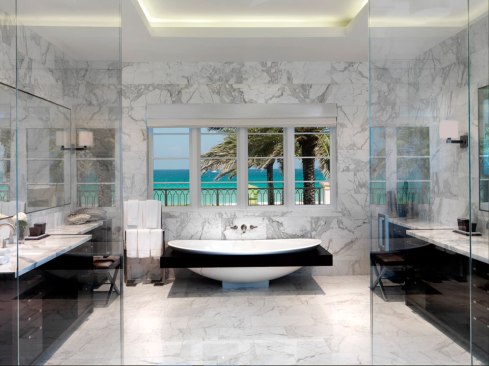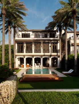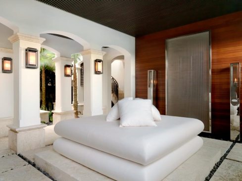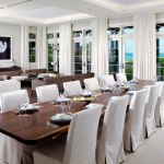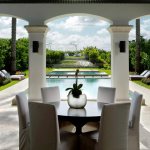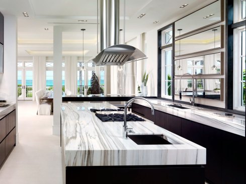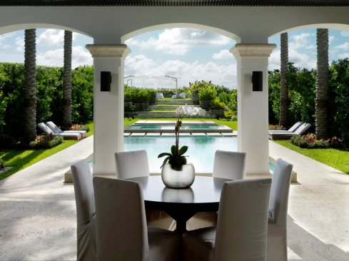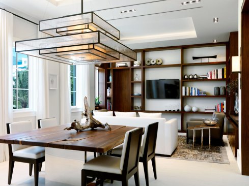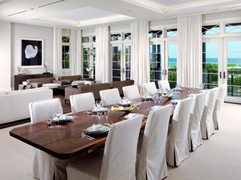 Modern meets mediterranean on Miami Beach. “The decor blends perfectly with the beach spirit and the overall experience,” builder Oscar Barbara notes. “it is sophisticated and elegant, yet very comfortable and homey.” Designer Michael Scigliano sourced the oversized dining table from furniture designer Jeffrey Greene. Greene found rare, 16 foot slabs of Black Walnut in a mill in the Pennsylvania Amish farm country. The bases were individually cast from a model that Greene sculpted in his studio. The entire tablescape is from Christofle. The porcelain and stemware, are from the Albi Collection. The flatware is from the Commodore Collection in Christofle Silver Plate. And the centerpieces are Gio Ponti Design for Christofle. Windows and doors throughout are Marvin, through Window Classics.