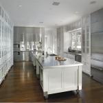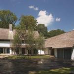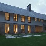 Joeb Moore, AIA, designed two perpendicular masses that track the lay of the land. The two-story “bridge” structure, built into a hill overlooking the river, contains the formal living spaces plus a study on the first floor; bedrooms and a laundry area occupy the second. The structure intersects a one-story bar-shaped volume that parallels the edge of a ravine and houses the project’s informal public spaces. “The forms are almost farmlike, but when you look closely at the detailing, it’s quite modern in its sensibility,” Moore says. Exterior materials are all about simple contrasts—wood siding from a Connecticut barn that ties into the original estate’s outbuildings, rusticated stone from the site, and white stucco.