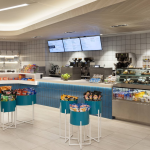 Guests at the busy Miami Airport Marriott now have more round-the-clock quick dining and food delivery options thanks to the hotel’s new Pantry – named MIA’s Pantry (MIA’s). CORE worked with the lobby designer, ownership, and Marriott team to create a unique identity for the 2,100 SF Pantry that reflects Miami’s iconic style, specifically exploring Miami Beach’s exuberant Art-Deco architecture. Formerly a Starbucks coffee shop, this Pantry provides greater convenience and extended F&B service for guests arriving or leaving on early morning and late evening flights when the typical 3-a-day restaurant is not open. CORE previously worked with Marriott to develop the Pantry design prototype and overall strategy to address evolving guest demographics and increase F&B sales across the brand. The Pantry initiative supplements and leverages existing F&B operations by offering guests additional options for fast-casual dining and food delivery within the hotel, complementing traditional room service. MIA’s Pantry at the Miami Airport Marriott is a continuation of CORE’s work with Marriott to expand this effort across their collection of full service hotels.