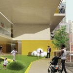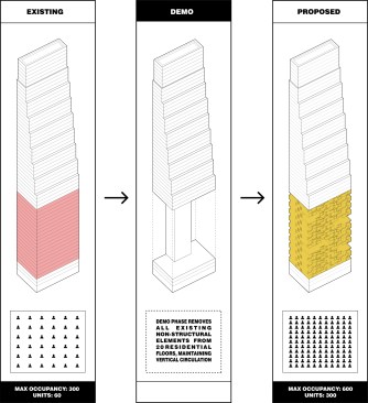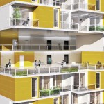 It is a modular system of prefabricated, energy-efficient and cost-effective micro-homes that can be installed in already built empty urban spaces. The number of units and their organization will be adapted to the buildings in which they will be deployed. Each unit is 270 square feet and features an ADA bathroom, queen size bed, kitchen and living/working space. The staggering of the units creates a push-and-pull relation, generating balconies for most units. Large public outdoor terraces provide social and co-working spaces, and safe place for children to play.