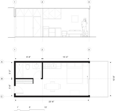 Reusing built spaces has environmental advantages: it conserves materials and resources, lowers carbon footprint, and brings old, energy-inefficient buildings up to current code. Carefully selected building materials and cladding ensure thermal insulation to lower energy use and costs for these micro-homes.