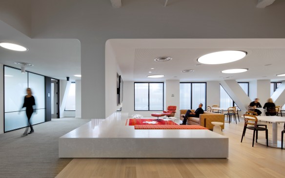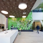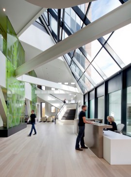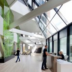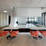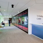 At approximately 85,000-square-feet, and encompassing five floors, Microsoft Cambridge involved repositioning the building entrance and creating a new customer entry at street level which leads to a 2nd floor Entry Plaza & Conferencing Center. This, in turn, connects to the 20,00-square-foot Microsoft Technology Center. Multi-purpose spaces on the 4th floor complete the customer / public experience. New elements to the project that have yet to been employed in other Technology Center U.S. sites include the interactive center, the “exploratorium,” a cafe, meeting / small event space, and an outdoor space adjacent to the cafe. The project features four basic work spaces: open workstations, cafe zones, long communal dining tables, and random tables and chairs. The two-story entry plaza contains dramatic 20-foot-high branded messaging elements as well as a reception point and hospitality zone, complete with espresso machine and a horizontal touch screen for a variety of leveraged content. SkB developed branding concepts and led the static branding design.