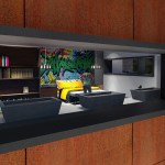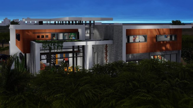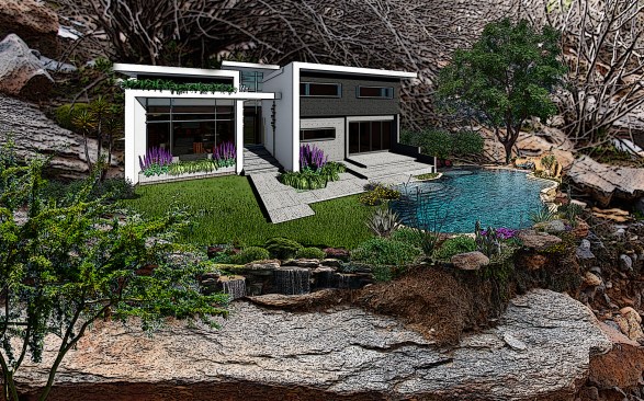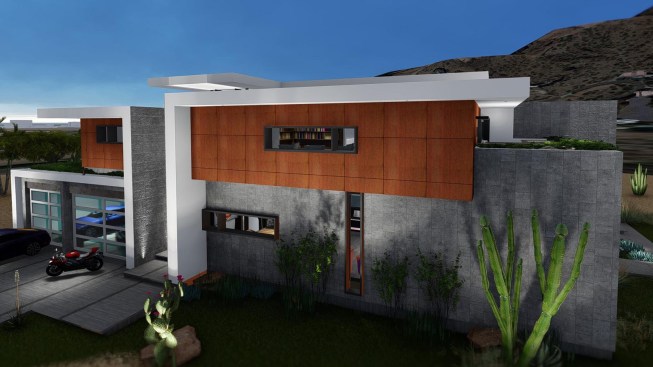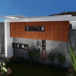 We are showing this facade with a beautifully orange rusted steel known as CorTen steel, contrasted with textured stone and EIFS exterior insulation and finish system offering super-high insulation values and zero maintenance as it never needs painting and never cracks! (one of our favorite exterior finishes~ especially in hot climates!)