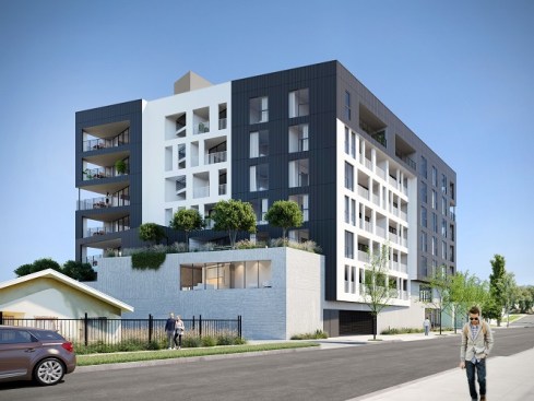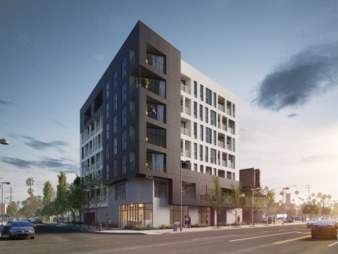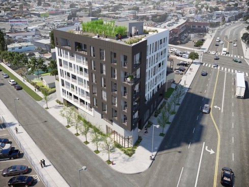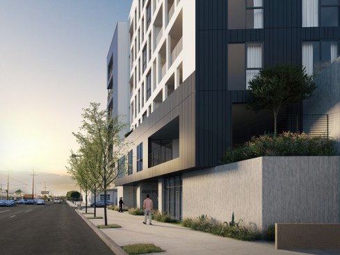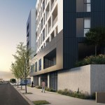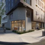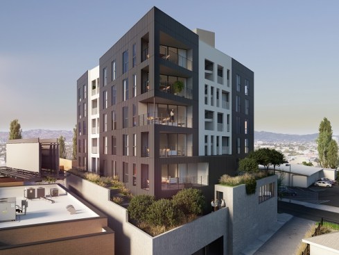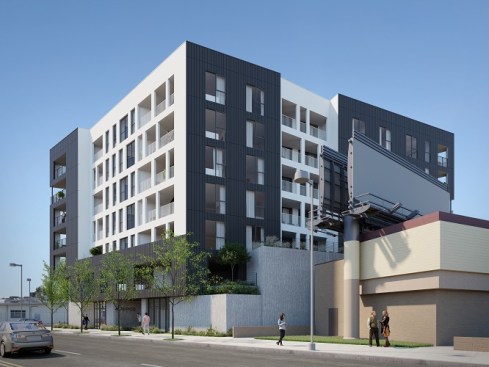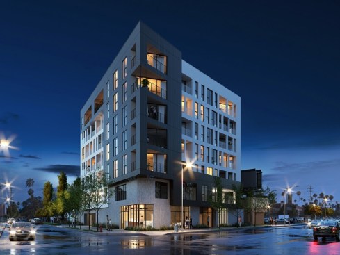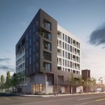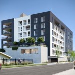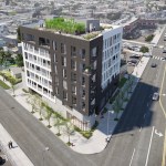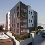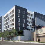 This is a mixed-use TOC project designed for the pedestrian experience. It includes low income housing, retail and commercial space. Concrete masses that support the building are pushed back at street level to make room for landscaping. Five levels of housing include 34 market-rate units and 6 one and two-bedroom affordable housing units. There are over 3,000 sq. ft. for commercial space and amenities, including a fitness center, parking and a roof terrace.