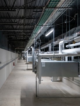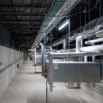 In order to optimize space, the design team integrated the building’s mechanical systems on an equipment platform that resides in the top half of the building. Building operations equipment, such as fan coil units that provide room-level control over temperature across the facility, is located on the equipment platform. This location allows maintenance access at all times without the need for ladders or lifts, helping to improve employee safety and minimizing any disruptions to building occupants.