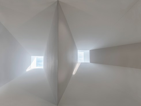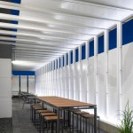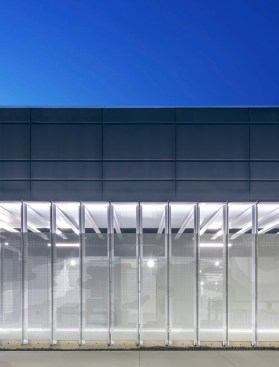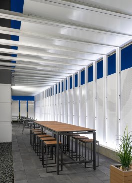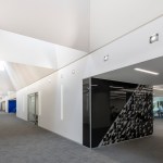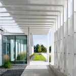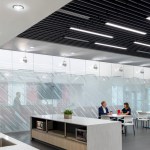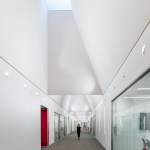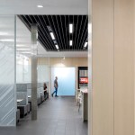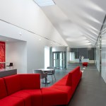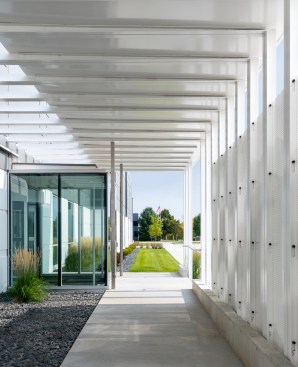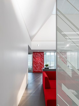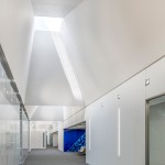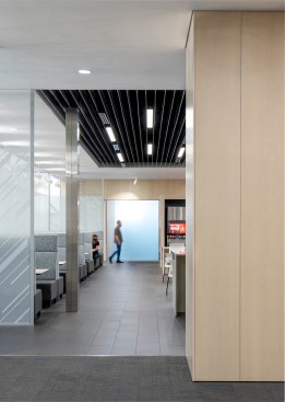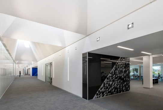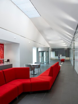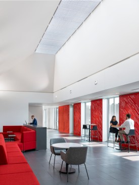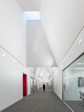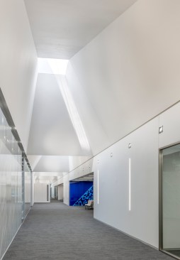 Office work areas and amenities are joined together by a light-filled circulation area that serves as a connective link throughout the building’s spaces and aims to reenergize employees. This 640-foot-long ‘Main Street’ is lined with a series of unique truncated pyramid skylights, each thoughtfully designed with its own size and character. This pathway introduces dynamic natural daylight into the core of the facility. A two-inch expansion joint that separates the vaults from the walls of the corridor allows the ceiling to accommodate snow-load deflections from the existing roof structure above. A pedestrian walking circuit also establishes a sense of occupant wellness and invites employees to move around throughout the workday. Imitating the daylighting strategies of its interior Main Street with vaulted skylight ceiling and full-glass partitions, the facility’s light-filled and secure public entry welcomes employees and visitors into the corporate office and conference center.