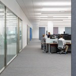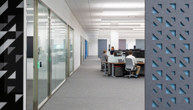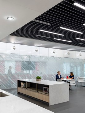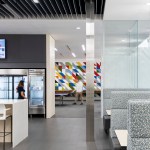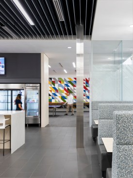 Previously, the facility’s compartmentalized space organization caused limitations in functionality, wayfinding, and access to views. The new design introduces over 70 formal and informal meeting areas, many of which are equipped with white boards and monitors, that focus on optimizing flexibility and productivity while creating opportunities for improved workflows and interaction among co-located business units. 120-degree workstation pods with the flexibility to expand and contract were installed in place of the facility’s existing cubicles to promote easy collaboration and reconfiguration for new workgroup arrangements.