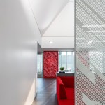 The 144-seat conference center is another primary feature of this renovation project, providing space for the client to host gatherings from across its larger organization. The conference center has the capability to divide into three separate rooms and offers a variety of adjacent public office amenities, including a 95-seat café, lounge area, and game room area.