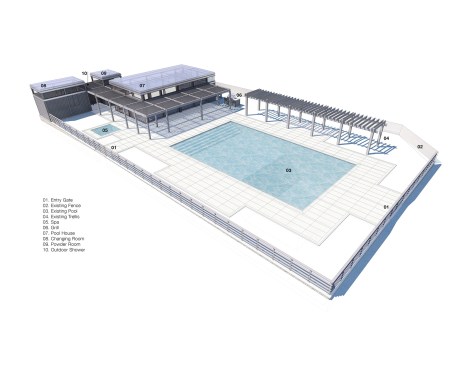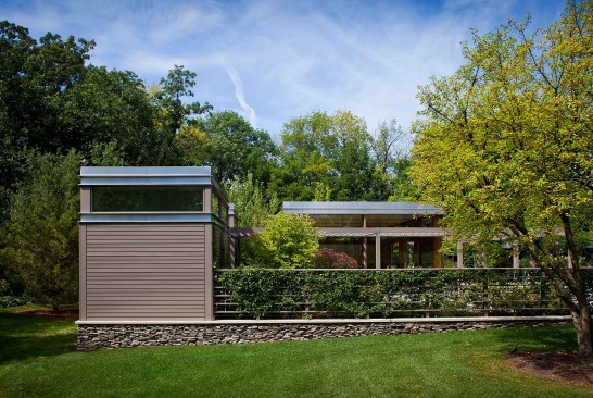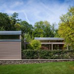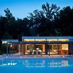 The Midwest pool house is an addition to a summer residence designed as a gathering place for an expansive family’s farm estate. The program of the addition is divided into a set of wood and glass pavilions that are tied together through a Douglas Fir trellis structure.