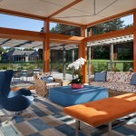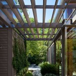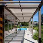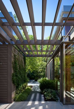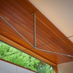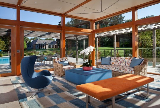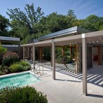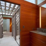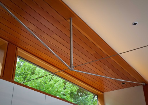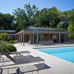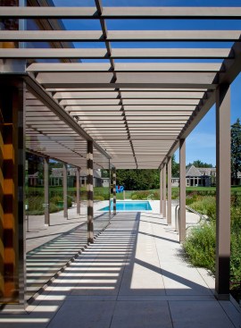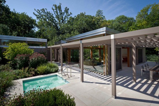 The main living space is comprised of a glass clerestory exterior that is integrated with the structure of the trellis, modulating direct sunlight during hot summer days and providing ample shade for outdoor terrace spaces. Providing a consistent architectural expression, the structure continues into the interior with stainless steel trusses connecting the beams of the trellis structure. The natural warmth of the Douglas Fir trellis is accentuated by illuminated fabric panels. Stone paving is pulled from the exterior pool deck and into the interior spaces, further enhancing the connection between the pavilions.