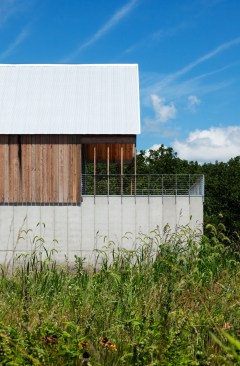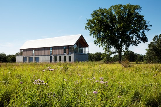 The retreat is located on a bucolic 700-acre site in the rolling hills of rural Iowa. The site originally contained a mix of prairie, woodland and former farmland. With assistance from the Iowa Department of Natural Resources, the owner has restored much of the fallow farmland and non-native woodlands back to its native prairie ecology. With its siting in an existing clearing, as well as its form and materiality, the building echoes the agrarian typologies of the region. The building is elongated in an east/west direction in order to maximize daylight control and to highlight views of the pond to the east and the lone tree to the west.