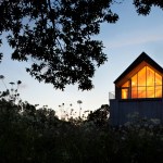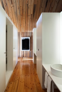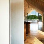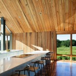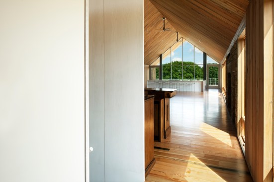 In addition to proper orientation, the project uses a number of other strategies to reduce its environmental impact. It is heated and cooled by a geothermal system, and the mechanical system is zoned to allow independent conditioning of the caretaker’s unit. Closed-cell spray foam insulation in the building envelope reduces infiltration and the need for an additional vapor barrier. Operable windows and ceiling fans promote natural ventilation. Eight-foot overhangs are employed at both ends to shade the low-e glass. Reclaimed wood is used for interior and exterior cladding and its natural preservatives ensure that exterior finish products are not required. No finish was used on this same wood at the interior walls and ceiling.