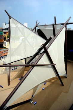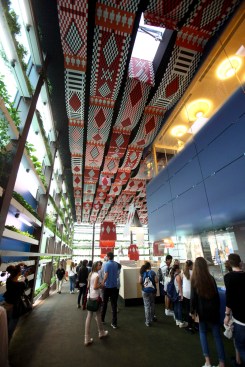 From the canyon where the water plays with the rocks, you arrive in the heart of the pavilion, a huge glass model which recounts the history of the area, taking visitors on a tour inside its "small fortress" (this is the meaning of the Arabic word from which Kuwait takes its name), from the different types of desert to the sea that washes the shores. Its highly scenic elements embody principles of recouping and saving natural energies. Surrounded by hydroponics outside (tomatoes, strawberries, salads), the largest space, used for dining and refreshment, is colored by the typical elements of the Arab souk and by a large central fire, allowing visitors to relax and enjoy the flavors of the Middle East.