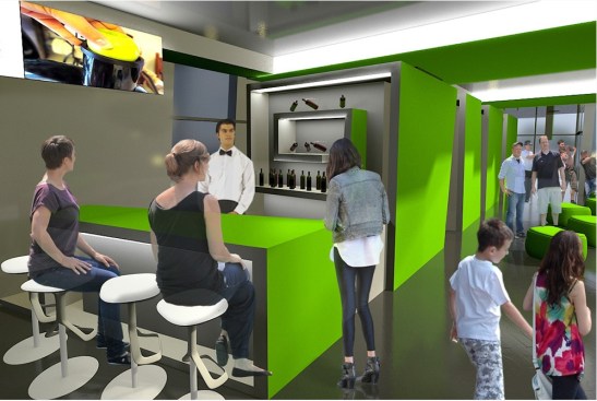 Laid out over three floors in a metal and glass structure enclosed by green wooden casings, the design of the Moldovan Pavilion reflects the look of a sliced apple.