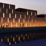pavilion, where you can indulge in traditional Moroccan dishes. The exterior features a series of segmented, rectangular metal boards at varying heights.