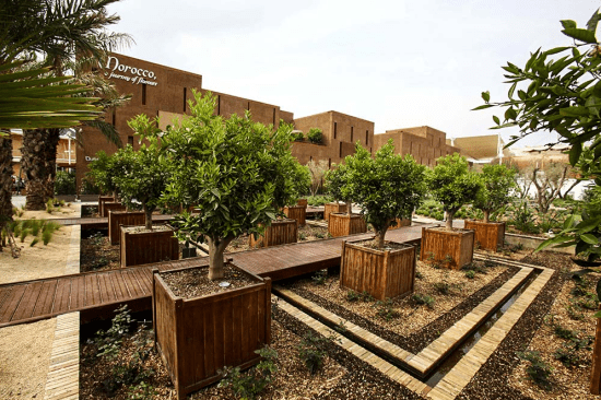 With its simple yet distinctive theme Morocco’s Pavilion is built around sensorial discovery, food and gastronomy, and represents all the diversity of the Country, showing the richness of its food and Visitors can discover the architectural expression of a trip through Morocco, with all the variety of its “terroirs”, its agronomical features and the different cultural traditions from one region to another.