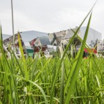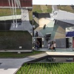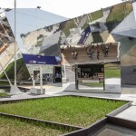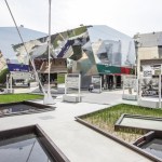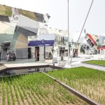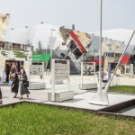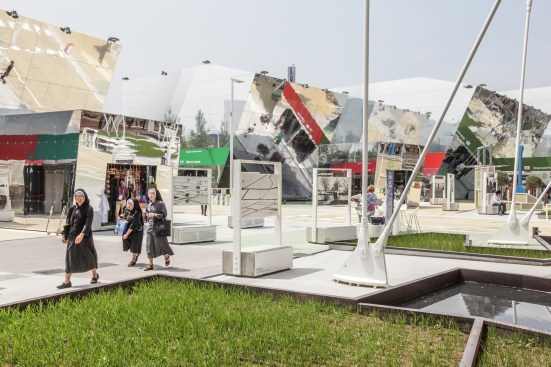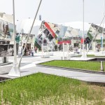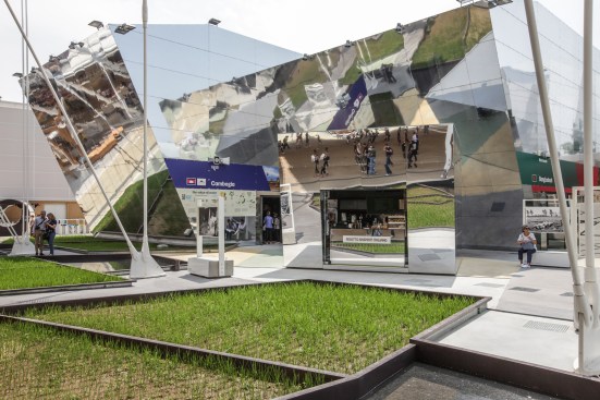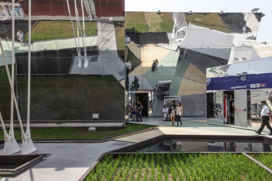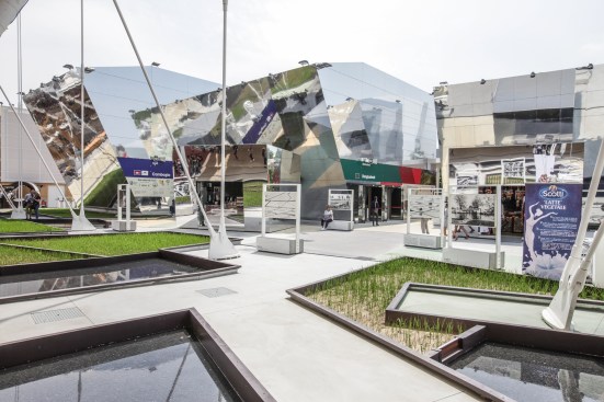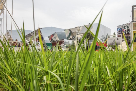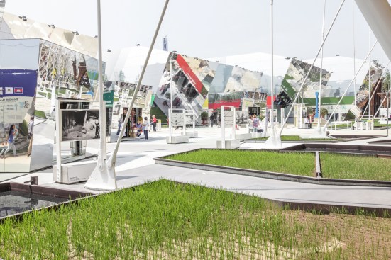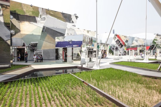 Reflective cladding creates the visual of water amid patches of rice in this cluster, which is devoted to the global production of the grain. The site is peppered with mobile equipment, the designers say, that can serve as seating, displays, and other surfaces while also referencing the rice sheaves that populate the fields during a harvest.