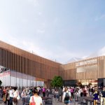 memorable design components for visitors: a wooden façade with reflecting glass panels, a semi-transparent